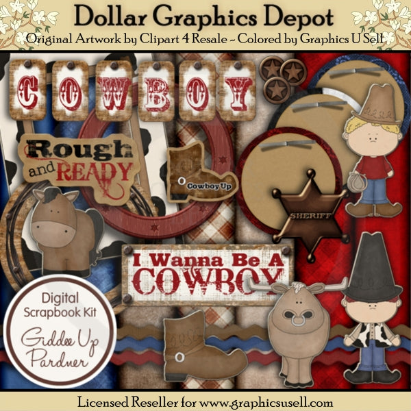 Questa collezione include cinque tag alfa country western, che compongono la parola "COWBOY", una stella in bronzo, nove elementi: un toro con lunghe corna, stivale da cowboy in pelle marrone, un cavallo marrone, un ragazzino con blue jeans, una camicia rossa , cappello da cowboy, stivali da cowboy e una corda da lazo, un ragazzino con blue jeans, una camicia color kaki, gilet di pelle di vacchetta, cappello da cowboy e stivali da cowboy, un distintivo di sceriffo in bronzo, un elemento grafico "Rough and Ready", un cowboy stivale con la scritta "Cowboy Up" e un cartello country western con la scritta "I Wanna Be A Cowboy", tre cornici: una in pelle di vacchetta bianca e nera da 5" x 7", con finiture marroni, distintivo dello sceriffo, pistola, cowboy cappello e stivale da cowboy, una cornice rotonda in legno, con dettagli in metallo, e una cornice rotonda rossa, con piccole stelle, tre etichette per diario: una con motivo a pelle di serpente rossa, una con motivo a pelle di serpente blu e una con pelle di vacchetta bianca e nera, tre bordi ricrac - rosso, blu e marrone e sette fogli di carta ruvida coordinati da 12" x 12" (3600 x 3600 pixel). Questo set contiene 31 pezzi.