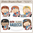 Questa collezione comprende cinque adorabili bambine del 4 luglio, che indossano graziosi abiti marrone chiaro, rossi, bianchi e blu, fiocchi per capelli e fasce per capelli, con stelle e strisce, bandiere americane, stelle filanti a forma di stella, una piccola stella, un segno patriottico che recita "God Bless America" e una grafica word art "God Bless America". Questo set contiene 6 grafici.
