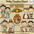 Questa collezione include un ragazzo indiano che indossa una camicia di pelle di daino marrone e acqua, leggings, mocassini e una fascia di piume con una ragazza indiana che indossa un abito di pelle di daino marrone e acqua e mocassini, un ragazzo pellegrino che indossa un abito da pellegrino marrone e beige e un cappello con un ragazza pellegrina che indossa un vestito e un cappello marrone e beige, un ragazzo indiano con un pesce su una lancia e un ragazzo pellegrino con un tacchino e un moschetto, una ragazza pellegrina e una ragazza indiana che preparano la tavola del Ringraziamento con un tacchino, ripieno e torta di zucca , pannocchia e una piccola zucca, un simpatico tacchino con un cappello da pellegrino e una grafica word art "Buon Ringraziamento". Questo set contiene 6 grafici.