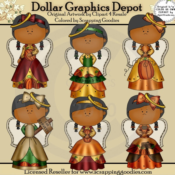 Questa collezione comprende sei angeli del raccolto, che indossano bellissimi abiti e fiocchi per capelli, in bordeaux, oro, arancione, verde, marrone chiaro e marrone, con tante piccole zucche autunnali e scritte con la scritta "Raccolto" e "Buon autunno", grazioso angelo ali, aloni dorati e un cartello autunnale con la scritta "Raccolto autunnale". Questo set contiene 6 grafici.