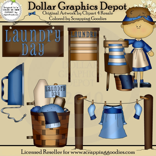 Questa collezione comprende un portabiancheria in legno, un cesto intrecciato pieno di vestiti, asciugamani, una scatola di sapone da bucato, un piccolo asse da stiro e un cartello con la scritta "Laundry Day", un ferro da stiro, uno stendibiancheria, con un vestito e un paio di di calzini appesi a mollette, una bella signora con una lavatrice strizzata vecchio stile, un secchio e degli asciugamani, e un cartello "Giorno di bucato". I colori includono: marrone, beige, marrone chiaro, blu, argento e nero. Questo set contiene 6 grafici.