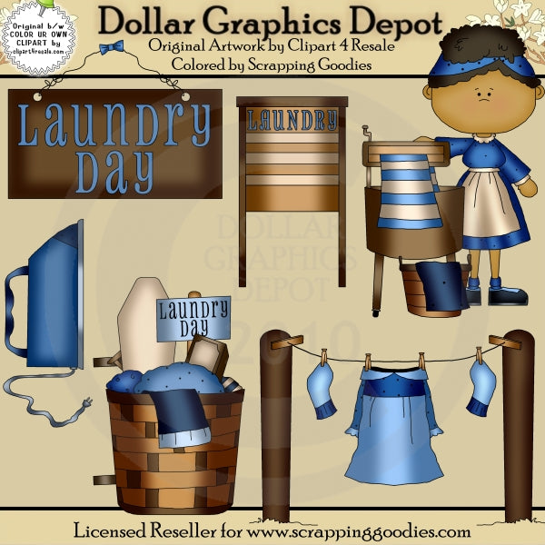 Questa collezione comprende un portabiancheria in legno, un cesto intrecciato pieno di vestiti, asciugamani, una scatola di sapone da bucato, un piccolo asse da stiro e un cartello con la scritta "Laundry Day", un ferro da stiro, uno stendibiancheria, con un vestito e un paio di di calzini appesi a mollette, una bella signora con una lavatrice strizzata vecchio stile, un secchio e degli asciugamani, e un cartello "Giorno di bucato". I colori includono: marrone, beige, marrone chiaro, blu, argento e nero. Questo set contiene 6 grafici.