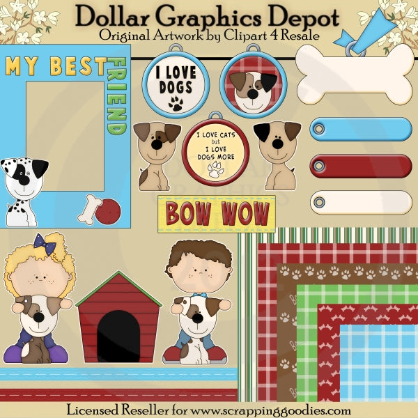 Questa collezione include una cornice da 5" x 7" con un cucciolo di cane, un osso di cane, una palla rimbalzante e la scritta "Il mio migliore amico", due nastri coordinati da 12" - un guinzaglio per cani rosso e un guinzaglio per cani blu, sei 12 " x 12" (3600 x 3600 pixel) coordinati con fogli di scarto e tredici elementi per cani - tre targhette ovali in blu, rosso e bianco, tre piastrine per cani - una con la scritta "I Love Dogs", una con un cucciolo di cane, e uno con la scritta "Amo i gatti ma amo di più i cani", un osso di cane, due cuccioli di cane, un ragazzino con un cucciolo di cane, una bambina con un cucciolo di cane, una cuccia rossa e un "Bow Wow" Grafica Word Art. Questo set contiene 22 pezzi.