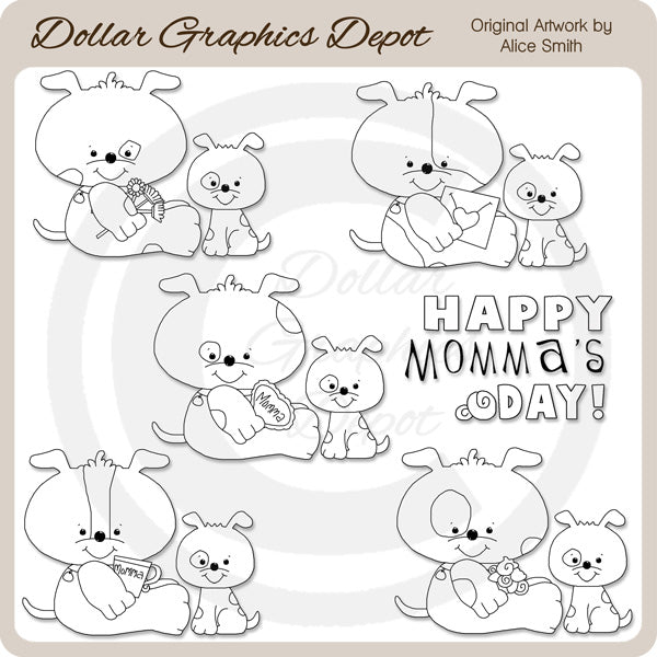 Questa collezione unica nel suo genere è disponibile solo presso Digital Craft Supplies. Questo set include adorabili cuccioli di cane per la festa della mamma, mazzi di fiori, una tazza con la scritta "Mamma", un biglietto per la festa della mamma in una busta, un cuscino a forma di cuore con la scritta "Mamma" e una scritta "Buona festa della mamma". grafico. NOTA BENE: questo set si coordina con la collezione "Momma's Day Pups - Clip Art" . Questo set esclusivo contiene 6 timbri digitali.