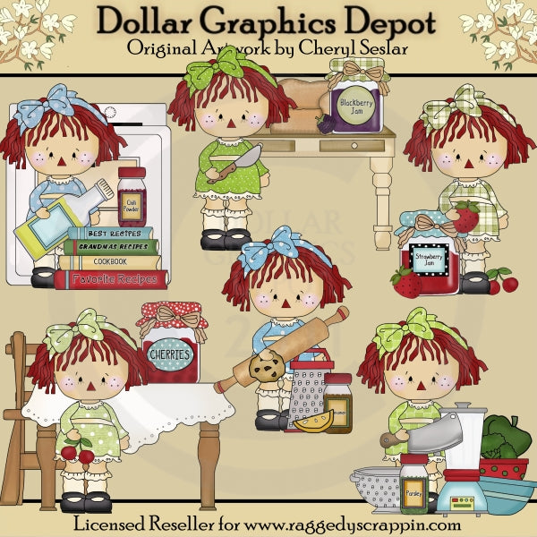 Questa collezione comprende sei adorabili bamboline di pezza, che indossano graziosi vestiti a quadri, a quadretti e a pois, un forno, libri di cucina, un barattolo di peperoncino in polvere, una bottiglia di olio d'oliva, un tavolo di preparazione in legno, una pagnotta di pane, un coltello da pane , un barattolo di marmellata di more, una mora, fragole, ciliegie, un barattolo di marmellata di fragole, un tavolo di legno con una graziosa tovaglia traforata, un barattolo di confettura di ciliegie, un mattarello di legno, una grattugia in metallo, un barattolo di cannella, un limone fetta, un biscotto con gocce di cioccolato, uno scolapasta di metallo, un barattolo di prezzemolo, ciotole colorate, broccoli, un peperone verde, una mannaia e un frullatore. Questo set contiene 6 grafici.