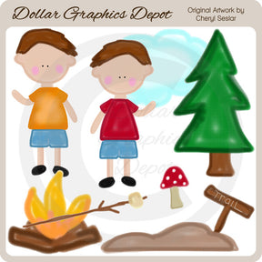 Questa collezione comprende due ragazzi in campeggio, nuvole gonfie, un pino, un fungo maculato, un falò, un marshmallow su un bastoncino e un sentiero con cartello. Questo set contiene 8 grafici.