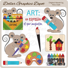 Questa raccolta include adorabili topolini, una scatola di pastelli, matite, tavolozze di colori, pennelli, un'immagine artistica, pastelli e un'immagine grafica "Arte: un'espressione della tua immaginazione". NOTA BENE: questo set si coordina con la collezione "School Days - Art - Scrap Papers" . Questo set contiene 9 grafici.