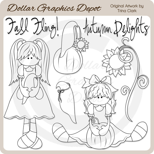 Questa collezione include adorabili ragazze autunnali, zucche autunnali, corvi, graziosi girasoli e due grafiche autunnali in word art: "Fall Fling" e "Autumn Delights". NOTA BENE: questo set si coordina con le collezioni "Delizie autunnali - Clip Art", "Delizie autunnali - Carta da ritagli" e "Delizie autunnali - Bordi ed etichette" . Questo set contiene 7 timbri digitali.