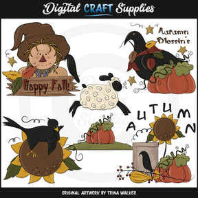 Questa collezione include uno spaventapasseri autunnale con foglie autunnali colorate, un corvo nero e un cartello in legno con la scritta "Buon autunno", un corvo nero con foglie autunnali colorate, stelle dorate, una zucca e la scritta "Benedizioni autunnali", un pezzo di erba con una pecora che salta sopra una zucca, un corvo nero sdraiato su una faccia di girasole e un portacandele di latta, un ramo di bacche, una zucca, una zucca, un girasole, un corvo nero e la parola arte "Autunno". Questo set contiene 5 grafici.