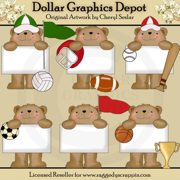 Questa collezione include sei adorabili orsetti sportivi "All Star" con cappellini da baseball, un pallone da pallavolo, bandiere, un casco da football, un pallone da calcio, una palla da baseball, una mazza da baseball, un pallone da calcio, un pallone da basket, un trofeo d'oro e bacheche vuote , da personalizzare. Questo set contiene 6 grafici.