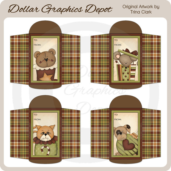 Questa collezione comprende quattro buste per biglietti regalo natalizi, raffiguranti graziosi animaletti natalizi: un orsacchiotto che fa capolino da una calza di Natale, un topo che fa capolino da una scatola di Natale avvolta con un bastoncino di zucchero, un gattino che fa capolino da un guanto natalizio e un cucciolo di cane che dà una occhiata intorno a un ornamento di Natale. NOTA BENE: Questo set si coordina con "Furbies di Natale - Clip Art", "Furbies di Natale - Cartoline", "Furbies di Natale - Etichette", "Furbies di Natale - Involucri per cupcake", "Furbies di Natale - Etichette firma", "Furbies di Natale - Collezioni "Stazionario", "Furbies di Natale - Etichette" e "Furbies di Natale - Blocchi" . Questo set contiene 4 buste per carte regalo stampabili.