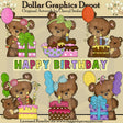 Questa collezione comprende sei adorabili orsetti, con graziosi fiocchi per capelli e fasce floreali, palloncini di compleanno, torte di compleanno a strati, candeline di compleanno, coriandoli per le feste, regali di compleanno incartati con graziosi fiocchi, un gelato, piccoli orsacchiotti di peluche e un "Happy "Compleanno" grafica word art. Questo set contiene 7 grafici.