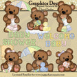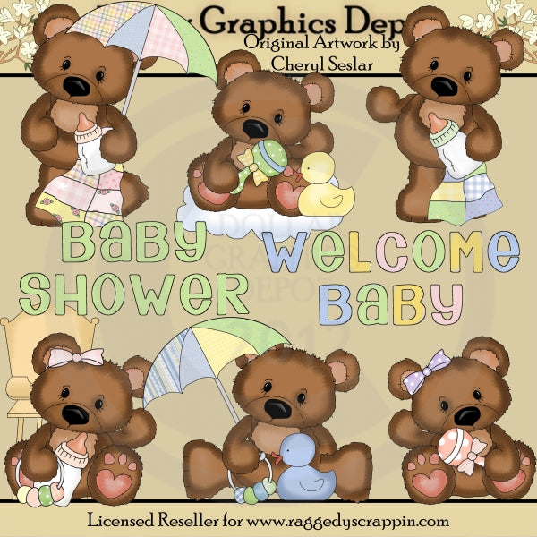 Questa collezione comprende sei adorabili orsetti, coperte trapuntate per bambini, biberon, ombrelli fantasia, una nuvola gonfia, sonagli per bambini, paperelle di gomma, anelli da dentizione, un seggiolone e due grafiche word art per bambini: "Baby Shower" e "Welcome Baby". ." Questo set contiene 8 grafici.