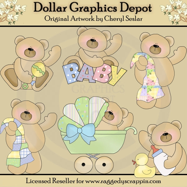 Questa collezione comprende sei adorabili orsetti, un sonaglio, la scritta "BABY", una trapunta per bambina, una trapunta per maschietto, una graziosa carrozzina, un biberon e una papera di gomma. Questo set contiene 6 grafici.