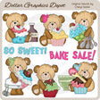 Questa collezione comprende adorabili orsetti bicolori, fiocchi per capelli colorati, cupcake glassati con confettini, ciliegie e fragole, una bottiglia di estratto di vaniglia, misurini, uno sbattitore elettrico, una ciotola, un cucchiaio di legno con glassa e due parole grafica artistica - "So Sweet" e "Bake Sale". Questo set contiene 8 grafici.