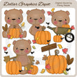 Questa collezione comprende cinque adorabili orsetti autunnali, foglie autunnali colorate, zucche autunnali, tife, una margherita, corvi neri, una carriola, una staccionata e un cartello "Buon autunno". Questo set contiene 5 grafici.