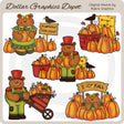 Questa collezione include adorabili orsetti, zucche autunnali, una carriola piena di zucche, cestini pieni di zucche, corvi neri, mucchi di fieno, foglie autunnali colorate e due segnali autunnali: "Zucche in vendita" e "I Love Fall". Questo set contiene 5 grafici.