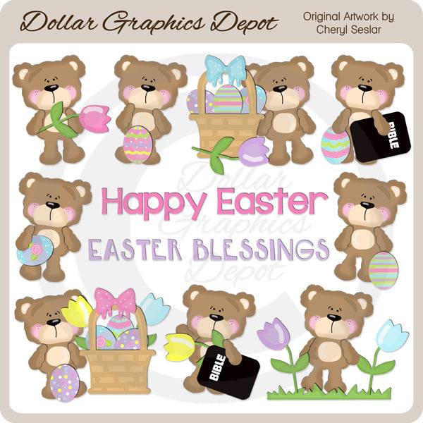 Questa collezione unica nel suo genere è disponibile solo presso Digital Craft Supplies. Questo set include adorabili orsetti pasquali: uno con un tulipano rosa, uno con una Bibbia e un uovo di Pasqua dipinto, uno con una Bibbia e un tulipano giallo, uno con un pezzo di erba e un tulipano color lavanda e blu, due con cestini pasquali, uova di Pasqua dipinte e tulipani colorati e tre con uova di Pasqua dipinte. Questo set include anche due grafiche word art pasquali: "Buona Pasqua" e "Benedizioni di Pasqua". Questo set esclusivo contiene 11 grafiche.