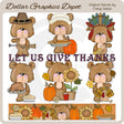 Questa collezione comprende sei adorabili orsetti del Ringraziamento, zucche autunnali, foglie autunnali colorate, cappelli da pellegrino, un copricapo di piume, un moschetto, una torta di zucca, pannocchie di mais, un piatto di tacchino arrosto, una torta di mele, una pianta di girasole in vaso, un mela rossa, un tacchino, una grafica word art "Let Us Give Thanks" e un bordo coordinato del Ringraziamento. Questo set contiene 8 grafici.