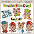 Questa collezione include adorabili orsetti di laurea con cappelli di laurea, diplomi, stelle colorate, una matita, un righello, una mela rossa, un blocco note, un evidenziatore e tre grafiche word art di laurea: "Giorno della laurea", "Lo hai fatto" e "Congratulazioni". Questo set contiene 9 grafici.