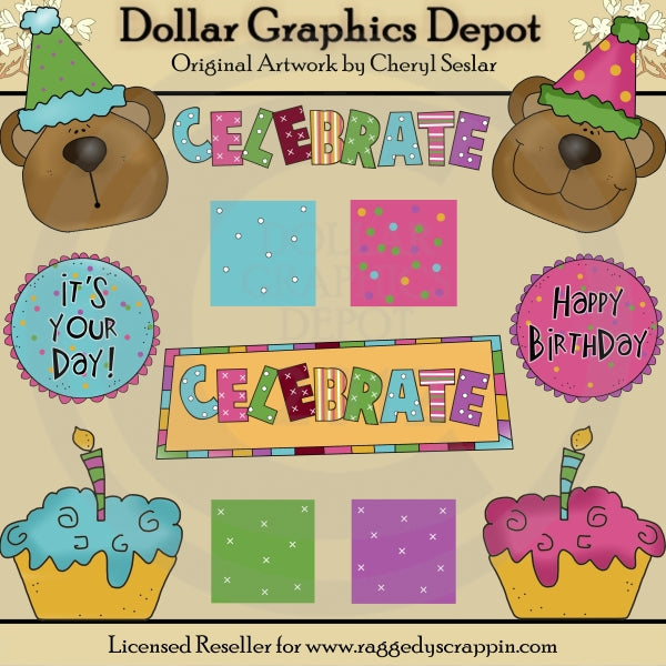 Questa collezione include due orsetti di compleanno con cappelli da festa, due cupcake glassati con candele, due cartelli di compleanno rotondi con la scritta: "È il tuo giorno" e "Buon compleanno", un cartello di compleanno rettangolare con la scritta: "Festeggia", una parola "Festeggia" grafica artistica e quattro sfondi coordinati per il compleanno. Questo set contiene 12 grafici.
