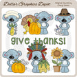 Questa collezione include adorabili koala del Ringraziamento con cappelli da pellegrino, un copricapo indiano, zucche, pannocchie di mais, una pianta di girasole in vaso, un tacchino, simpatici topolini e una grafica word art "Ringrazia". Questo set contiene 7 grafici.