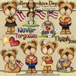 Questa collezione comprende sei orsi del Memorial Day, bandiere americane, cuori, stelle, macchie d'erba, fiori, una croce di legno con nastro e stella, lapidi con cuori e word art "Some Gave All" e due grafica word art del Memorial Day - " Mai dimenticato" e "Grazie". Questo set contiene 12 grafici.