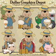 Questa collezione comprende sei adorabili orsetti contadini, che indossano una tuta di jeans blu e cappelli di paglia, un fienile rosso, un trattore verde, un silo torre, balle di fieno, staccionate, una quercia, un pollo, un cavallo, un agnello, una mucca, un gallo, e maiale. Questo set contiene 6 grafici.