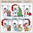 Questa collezione comprende sei adorabili orsetti polari, cappelli di Babbo Natale, bastoncini di zucchero, regali di Natale incartati, un albero di Natale decorato, un filo di luci di Natale, una calza di Natale piena di dolcetti, una ciotola di biscotti di Natale, una tazza di cioccolata calda con un agitatore per bastoncini di zucchero, un lecca-lecca alla menta piperita, un omino di pan di zenzero, una tazza di cioccolata calda da asporto e una grafica word art "Have Yourself A Merry Little Christmas". Questo set contiene 7 grafici.