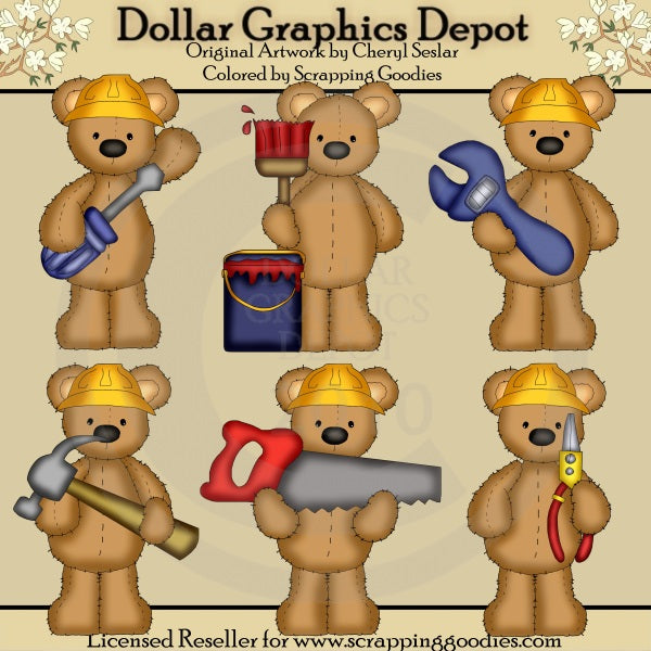 Questa collezione comprende sei piccoli orsetti da costruzione, con cappelli da costruzione gialli, un cacciavite, un barattolo di vernice, un pennello, una chiave inglese, un martello, una sega e una pinza. Questo set contiene 6 grafici.