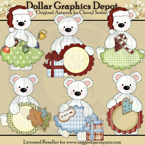 Questa collezione comprende sei adorabili orsi polari imbalsamati, con cappelli di Babbo Natale, regali di Natale avvolti con graziosi fiocchi, una serie di luci natalizie, biscotti natalizi decorati e graziosi cartelli natalizi smerlati, per aggiungere la tua personalizzazione personalizzata. Questo set contiene 6 grafici.