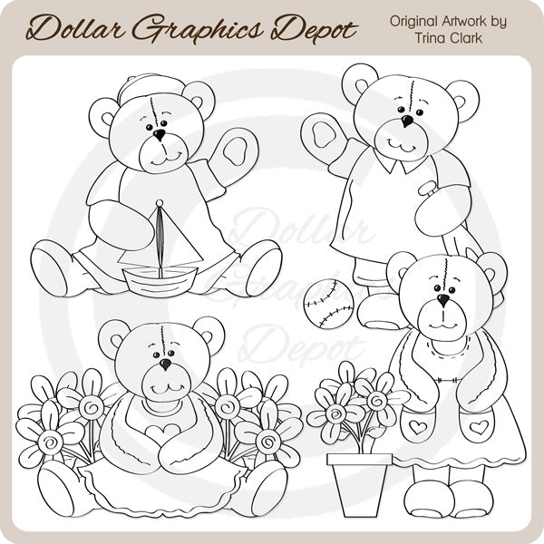 Questa collezione include adorabili orsetti estivi con graziosi abitini, una barca a vela, una palla da baseball, una mazza da baseball, graziosi fiori e un vaso pieno di fiori. NOTA BENE: questo set si coordina con la collezione "Summer Cutie Bears - Clip Art" . Questo set contiene 4 timbri digitali.