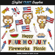 Questa raccolta include tre gufi del 4 luglio, fuochi d'artificio, stelle cadenti, razzi, petardi, bandiere americane, cappelli a cilindro patriottici, una fetta di anguria, un hot dog, una torta di ciliegie appena sfornata e grafica con quattro parole: "Happy", "Quattro luglio", "Fuochi d'artificio" e "Picnic". Questo set contiene 21 grafici.