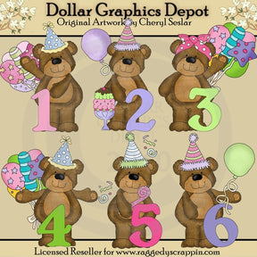 Questa collezione comprende sei adorabili orsetti, cappellini da festa colorati, una fascia a pois, palloncini di compleanno, un soffiatore per feste, un gelato, coriandoli per la festa e numeri di compleanno 1, 2, 3, 4, 5 e 6. I colori includono : marrone, rosa, viola, verde, giallo, acqua, nero, beige e bianco. Questo set contiene 6 grafici.