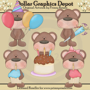Questa collezione include sei graziosi orsetti di compleanno, palloncini colorati di compleanno, un cappello da festa, un soffiatore per feste, coriandoli, cupcake di compleanno con candele e una torta di compleanno con glassa, confettini e candele. Questo set contiene 5 grafici.
