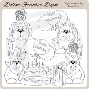 Questa collezione include adorabili cagnolini con cappelli da festa, graziosi fiocchi per capelli, palloncini di compleanno, un regalo di compleanno incartato e una torta di compleanno glassata con candeline. NOTA BENE: questo set si coordina con la collezione "Birthday Doggies - Clip Art" . Questo set contiene 4 timbri digitali.