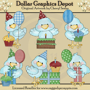 Questa collezione comprende sei dolci uccellini blu, palloncini di compleanno, cappelli da festa, regali incartati con graziosi fiocchi, cupcake decorati con candele e una torta di compleanno glassata con una candela. Questo set contiene 6 grafici.