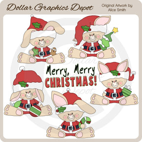 Questa collezione unica nel suo genere è disponibile solo presso Digital Craft Supplies. Questo set include adorabili coniglietti di Natale, vestiti con abiti e cappelli di Babbo Natale, biscotti natalizi ritagliati, un albero di Natale, ornamenti natalizi, un bastoncino di zucchero, un regalo di Natale incartato e una grafica word art "Buon, buon Natale". Questo set esclusivo contiene 6 grafiche.