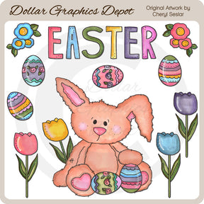 Questa collezione include un coniglietto pasquale, uova di Pasqua dipinte, tulipani colorati, graziosi fiori primaverili e una grafica word art "Pasqua". Questa collezione è stata realizzata utilizzando una speciale tecnica di colorazione che esalta le sfumature e la texture della grafica. Sono davvero carini...e unici! Questo set contiene 11 grafici.