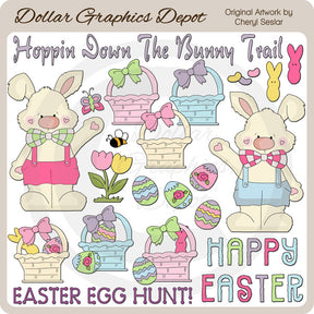Questa vasta collezione include coniglietti pasquali, cestini pasquali pieni, cestini pasquali vuoti (da riempire), uova di Pasqua dipinte, graziosi tulipani primaverili, una farfalla, un calabrone, marshmallow Peeps, caramelle gommose e tre grafiche di word art pasquali - " Hoppin Down The Bunny Trail, "Easter Egg Hunt" e "Happy Easter." Questo set contiene 21 elementi grafici.
