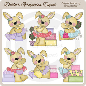 Questa collezione comprende sei coniglietti della spesa trasandati con fermagli per capelli floreali, tutù arruffati, graziose borsette, una borsa della spesa, una carta di credito, scatole decorate e graziosi topiari floreali. Questo set contiene 6 grafici.