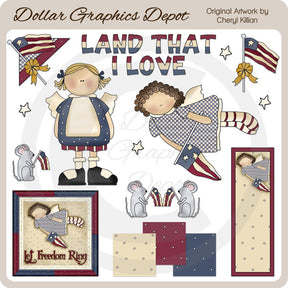 Questa ampia collezione comprende due angeli primitivi Americana, una bandiera americana con un nastro giallo, un topo con una mini bandiera americana, due topi con bandiere americane, una mini stella (duplicata nell'anteprima), un angolo Americana con una bandiera americana e un nastro giallo, scritta "Land That I Love", un segnalibro Americana da 2" x 6" stampabile, un angelo Americana da 4" x 4" e un blocco di vetro con scritta "Let Freedom Ring" stampabile e tre tessere di sfondo coordinate a pois . Questo set contiene 13 pezzi: 8 elementi grafici, 2 stampabili e 3 tessere di sfondo.