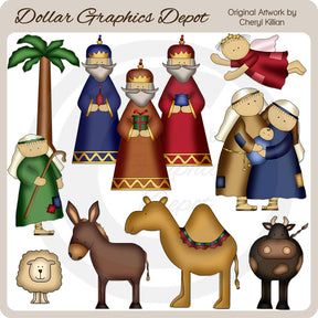 Questa collezione comprende un bellissimo presepe: un grazioso angelo, che indossa un vestito rosso e un'aureola dorata, Giuseppe e Maria, che indossano abiti color talpa e blu e copricapi beige, Gesù bambino avvolto in una coperta blu, tre uomini saggi, vestiti di blu, marrone, e vesti rosse e corone abbinate, che portano doni d'oro, incenso e mirra, un pastorello che indossa una veste verde e un copricapo beige, con un bastone, una palma verde e marrone, una mucca maculata marrone, un cammello dorato, un asino marrone e una graziosa pecorella beige. Questo set contiene 11 grafici.