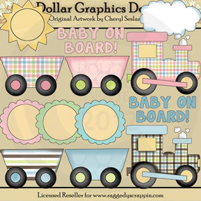 Questa ampia collezione comprende un set di trenini choo choo in tre pezzi in rosa, verde, blu e bianco, un set di trenini choo choo in tre pezzi in blu, marrone, verde e bianco, un sole, una nuvola gonfia, tre cornici smerlate in rosa , verde e blu e due grafiche word art "Baby On Board", in rosa e blu. Questo set contiene 13 grafici.