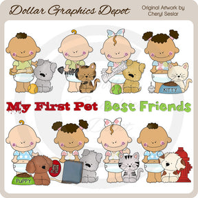 Questa collezione unica nel suo genere è disponibile solo presso Digital Craft Supplies. Questa collezione comprende otto adorabili neonati e bambine con dolci cuccioli di cagnolino e gattini, un osso di cane, palline da tennis, una lisca di pesce, un giornale, un simpatico topolino, una ciotola di cibo per gattini, una ciotola di cibo per cuccioli, un sacchetto di cibo per cani, un idrante e due grafiche word art: "Il mio primo animale domestico" e "Migliori amici". Questo set esclusivo contiene 10 grafiche.