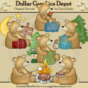 Questa collezione include sei adorabili orsetti da campeggio, sacchi a pelo, alberi di pino, repellente per insetti, la luna, le stelle, un cartello da campeggio in legno (da personalizzare), una lanterna da campeggio, zaini, una bussola, un braciere di ciottoli, un marshmallow su un bastoncino e un delizioso s'more. Questo set contiene 5 grafici.