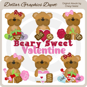 Questa collezione include sei adorabili orsetti di San Valentino, cuori di San Valentino smerlati rossi e rosa, cuori di conversazione, un biglietto di San Valentino in una busta, rose rosa e rosse, tartufi di cioccolato, fragole ricoperte di cioccolato, caramelle di San Valentino incartate e una scritta "Beary Sweet Valentine" grafico. Questo set contiene 7 grafici.