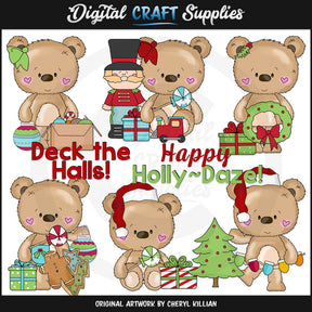 Questa collezione include sei adorabili orsetti di Natale: due degli orsetti hanno fiocchi per capelli e uno ha un fermaglio per capelli con bacche di agrifoglio, e due degli orsetti maschi hanno cappelli di Babbo Natale: palline di vetro colorate, una scatola piena di ornamenti natalizi assortiti, avvolti Regali di Natale, un trenino di legno, un soldatino, lecca-lecca, una ghirlanda di Natale, biscotti di Natale ghiacciati, un omino di pan di zenzero, una tazza di Natale dipinta, un albero di Natale decorato, luci natalizie colorate e due grafica word art natalizia - "Deck The Halls" " e "Happy Holly~Daze." Questo set contiene 8 grafici.