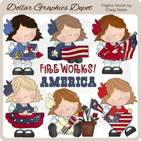 Questa collezione include ragazze americane, con graziosi vestiti e fiocchi per capelli abbinati, fuochi d'artificio, bandiere americane, bandierine patriottiche, una pianta in vaso con fiori rossi, bianchi e blu e una bandiera, un cuore americano e due grafiche word art del 4 luglio: "Fuochi d'artificio!" e "America". Questo set contiene 8 grafici.