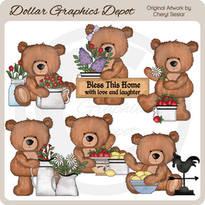 Questa collezione comprende sei adorabili orsetti di campagna, un barattolo di vetro con graziosi fiori, brocche di campagna piene di fiori colorati, una bella margherita recisa, un vaso pieno di fragole, una ciotola dipinta piena di fragole, una pentola piena di limoni, una ciotola dipinta piena con limoni, una banderuola con un gallo di campagna e un cartello di campagna che dice: "Benedici questa casa con amore e risate". Questo set contiene 6 grafici.